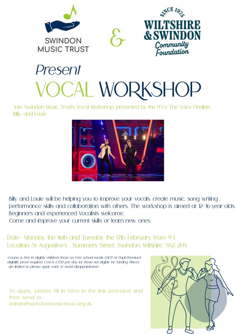 For instrumental/vocal tuition, you can apply for funding by completing the application form. You may either complete the online funding application form or you can also download and print off the form to fill in. Please email your completed form and all supporting evidence to ku.oc.tsurtcisumnodniws@nimda. If you are applying for lessons via the Swindon Music Co-Operative, please visit www.swindonmusiccooperative.co.uk for an application for music lessons.